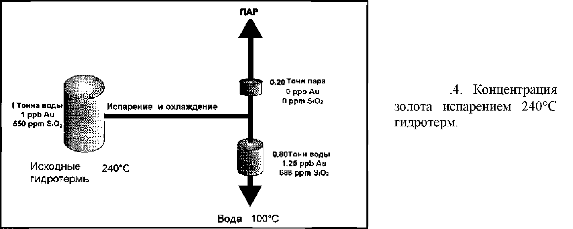 Испарение. Этот процесс более эффективен в качестве концентратора золота в растворе в небольшом масштабе, но не очень эффективен при образовании больших зон концентрированного отложения, поскольку энергетические затраты высокие. Выброс гидротерм при 240°С при падении давления до атмосферного (т.е. до 100°С) будет вызывать повышение концентрации лишь на 1/5 часть, которая приходится на уменьшение объёма гидротерм в виде пара, что слишком незначительно (рис.4). Более продолжительное испарение на поверхности в горячих котлах (прудах) может привести к образованию кремнистых золотосодержащих отложений (гейзерит), но обычно они не имеют промышленного значения. В связи с этим увеличение объёма рудосодержащих минералов может уменьшить содержание золота.
