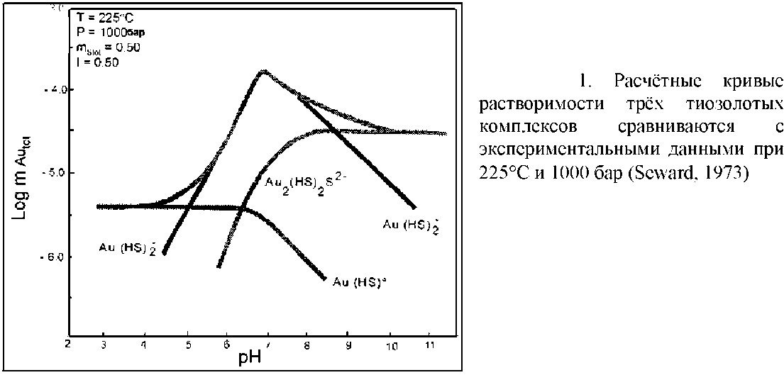 Бисульфидные комплексы золота плохо растворимы и, таким образом, концентрации золота в гидротермальных растворах низкие. Но гидротермальные системы имеют большие размеры и функционируют продолжительное время. Было подсчитано, что до 5 кг/год золота в настоящее время отлагается в гидротермальной системе Бродландс - Охааки в Новой Зеландии. Следовательно, месторождение с запасами 100 тонн могло бы образоваться в течение 20 000 лет. Некоторые системы могут действовать в десятки раз дольше. Sander, Einaudi (1990) пришли к выводу, что запасы золота в Раунд Монтейн в 500 тонн могли отложиться в течение 100 000 лет. Экспериментальные оценки (Seward, 1973) различных видов водных золотых комплексов показывают, что Au (HS) >2>-, по-видимому, преобладает в гидротермах при почти нейтральных рН и малой минерализации. Это позволяет предполагать его участие при образовании эпитермальных месторождений лоу сульфидейшн (рис.1). Расчёт масс-балансов (Brown, 1986), после открытия золото содержащих осадков в геотермальных трубопроводах, согласовывались с экспериментальными данными. Места осаждения осадков при внезапном падении давления свидетельствуют, что золото осаждается в результате кипения. Компьютерное моделирование (Dummond, Ohmoto, 1985) также показало, что золото может отлагаться в результате кипения или смешения гидротерм с водами разного химического состава.