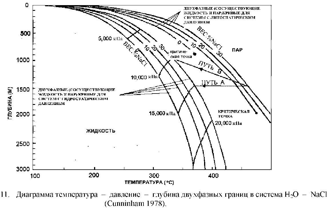 Важной характеристикой порфировых месторождений является эволюция состава гидротерм во времени. Первоначально гидротермы могут находиться при высоком давлении, равным или выше литостатического (рис.10,11).