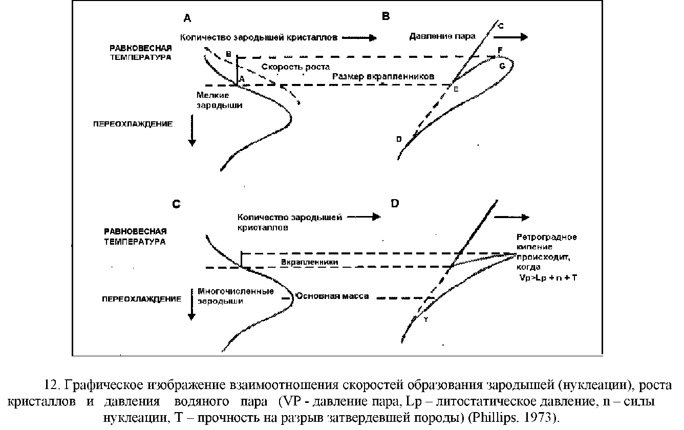 Магматические гидротермы выделяются (отделяются) от остывающей интрузии в виде явления (процесса) известного, как вторичное кипение (Phillips, 1973). Это происходит в результате пересыщения летучими компонентами, по мере того, как они концентрируются в остающемся расплаве при кристаллизации вкрапленников (рис.12). Самым важным продуктом кристаллизации расплавов является плагиоклаз, который образуется в ответ на понижение давления.