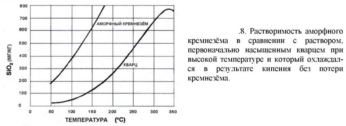 Кремнезём более растворим при высоких температурах и различные его полиморфные разности имеют разную растворимость. Гидротермы, которые насыщены по отношению к кварцу на глубине, становятся пересыщенными и отлагают кремнезём, по мере того как они поднимаются вверх и остывают. В соответствии с законами кинетики отложения кремнезёма аморфный кремнезём является обычной фазой, контролируемой растворимостью на малых глубинах (рис.8).