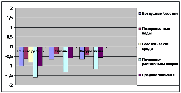 Наименее устойчивы к техногенным нагрузкам территории безлесные урочища речных долин, т.к. они характеризуются высокой эрозионной активностью и неустойчивостью почв к размыву, довольная высокой степенью загрязнения поверхностных вот и застойным режимом воздушных массами.