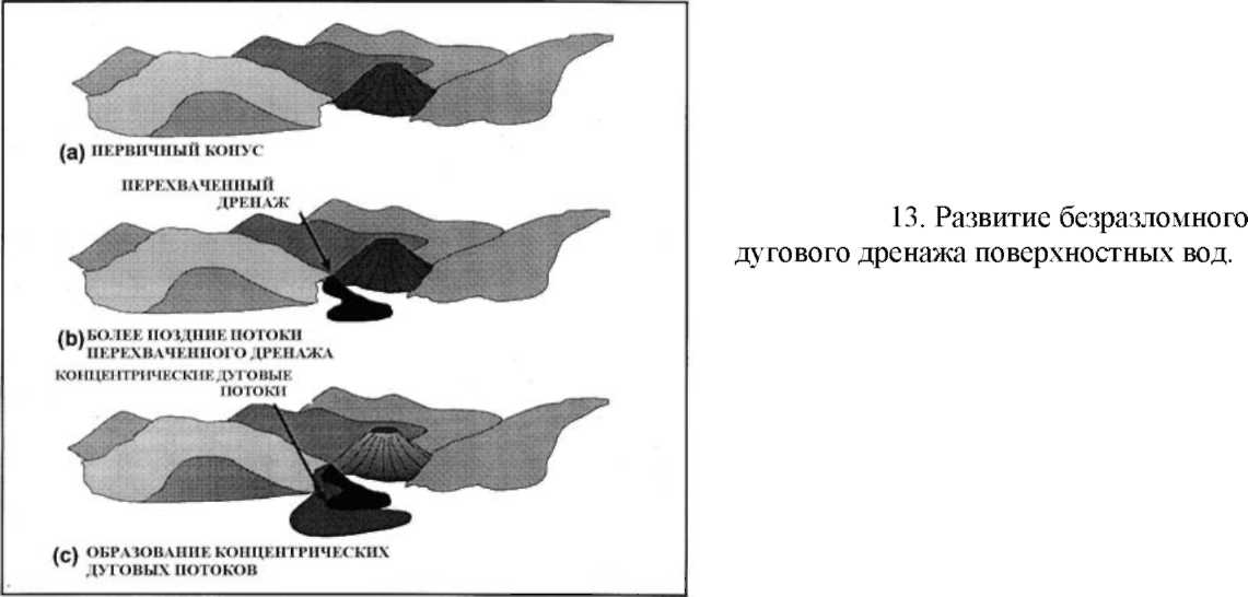 Аналогичный комментарий применяется к интерпретации кольцевых разломов и кальдер. Такие структуры встречаются в вулканических районах и в некоторых случаях могут представлять объект для разведки, для которого характерна значительная проницаемость. Однако не все субкольцевые структуры имеют такой генезис. Другие объяснения включают оползневые амфитеатры, литологические контакты, границы вулканических кольцевых равнин (рис.13), эродированные структурные куполы и крупные карстовые образования.