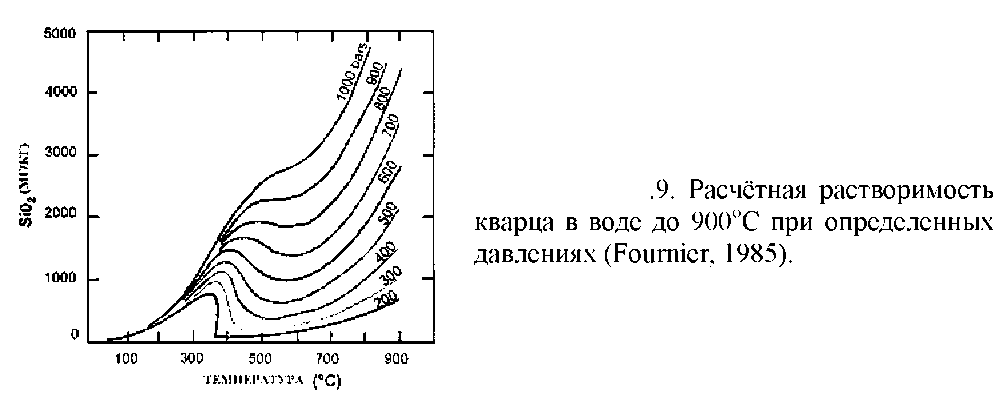 Другой фактор, приводящий к уменьшению проницаемости на глубине, - это процесс образования зон окремнения (отложение кремнезёма). Магматические летучие поздних стадий магматизма и гидротермы обычно близки к состоянию насыщения кремнезёмом, потому что они находятся в равновесии с породами, содержащими кремний. Однако растворимость кремнезёма зависит, как от температуры, так и от состояния гидротерм. Надкритические летучие могут содержать значительно больше кремнезёма в растворённом состоянии, чем вода при критических температурах (рис.3.9). Таким образом, летучие (флюид), остывая от почти магматических надкритических температур до близ критических, становятся пересыщенными по отношению к кремнезёму и из них отлагается кварц. Нельзя назвать точную температуру этого процесса, поскольку критическая температура водного раствора зависит от его минерализации. Но в некоторых условиях вблизи остывающего плутона будет располагаться зона, в которой отлагается кремнезём, тем самым, снижая проницаемость. Этому, вероятно, способствует процесс отделения магматических летучих около плутона и выше расположенных конвекционных гидротерм, которые, в основном, имеют метеорное происхождение.