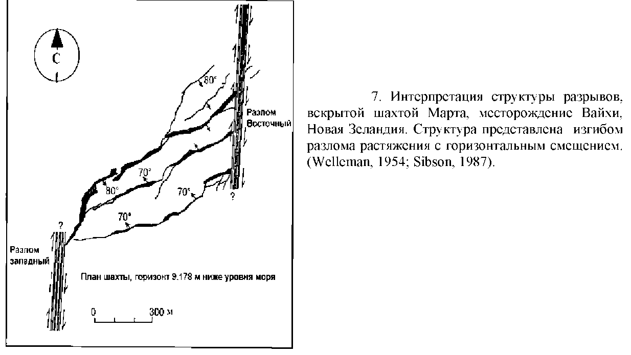 Исследование этой структурной ситуации также объясняет, почему некоторые жильные месторождения "прерываются" разломами, а не образуются расширения жил (рис.7).