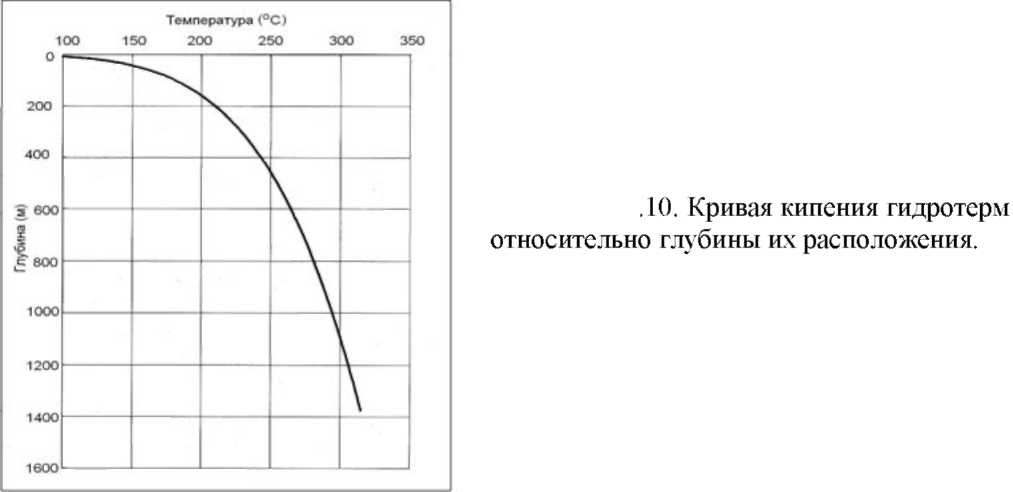 Верхняя часть высокотемпературных гидротермальных систем до глубины 1000 м, где температуры снизу вверх изменяются от 240-2600С до значений температур, характерных поверхностным термопроявлениям, представляет собой интервал, в котором происходит интенсивное гидротермальное брекчирование. Иногда этот процесс сопровождается гидротермальными извержениями. Таким образом, эта часть гидротермальных систем является зоной наиболее вероятного эпитермального рудообразования. Причину этого легко установить при анализе поведения кривой кипения гидротерм в зависимости от глубины их расположения: относительный градиент давления значительно больше вблизи дневной поверхности (рис.10). В пределах этой зоны газ может также выделяться из обычных гидротерм и аккумулироваться под газоизолирующей кровлей, представленной изменёнными породами (аргиллитами, отложениями кремнезёма), создавая условия, провоцирующие гидротермальные извержения. Этот горизонт в гидротермальных системах, расположенных в вулканогенных структурах с сильно расчленённым рельефом, может быть водовмещающим и в его составе присутствовать гидротермы разнообразного состава. В свою очередь, процесс преобразования верхней части гидротермальной системы, обусловленный взаимодействием двух сред вода-порода, может привести к уменьшению проницаемости этой части гидротермальной системы.