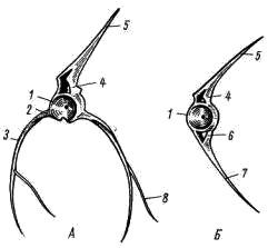 Рис. 2. Позвонки судака. А — туловищный позвонок; Б — хвостовой позвонок: 1 — тело позвонка, 2 — поперечный отросток, 3 — ребро, 4 — верхняя дуга, 5 — верхний остистый отросток, 6 — нижняя дуга, 7 — нижний остистый отросток, 8 — мышечная косточка