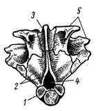 Рис. 4. Затылочный отдел осевого черепа судака: 1 — основная затылочная кость, 2 — боковая затылочная кость, 3 — верхняя затылочная кость, 4 — затылочное отверстие, 5 — ушные кости