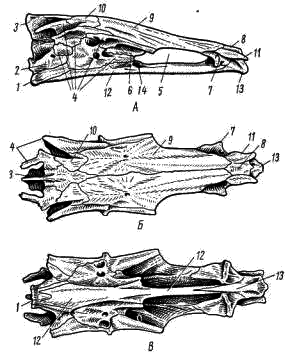 Рис. 3. Осевой (мозговой) череп судака. А — сбоку; Б — сверху; В — снизу: 1 — основная затылочная кость, 2 — боковая затылочная кость, 3 — верхняя затылочная кость, 4 — ушные кости, 5 — глазница, 6 — боковая клиновидная кость, 7 — боковая обонятельная кость, 8 — средняя обонятельная кость, 9 — лобная кость, 10 — теменная кость, 11 — носовая кость, 12 — парасфеноид, 13 — сошник, 14 — основная клиновидная кость