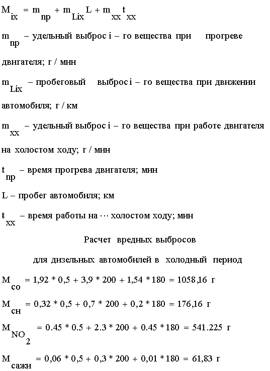 Расчет выбросов загрязняющих веществ от передвижных источников выполнен по "Методике проведения инвентаризации выбросов в атмосферу для автотранспортных предприятий" М., 1992г. Расчет производится по формуле: