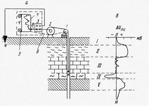 Схема каротажа ПС способом потенциала с полуавтоматической регистрацией: а - схема установки: 1 - блок-баланс, 2 - лебедка с коллектором, 3 - милливольтметр, 4 - регистратор, 5 - лентопротяжный механизм, соединенный гибким валиком (6) с роликом блок-баланса, 7 - диаграммная бумага, 8 - карандаш; б - диаграмма естественных потенциалов по стволу скважины: I (почва) и III (известняки) - пласты со слабой электрохимической активностью, II (суглинки) и V (глины) - пласты с положительными аномалиями ПС, IV - пласт с отрицательной аномалией ПС, характерной для проницаемых слоев |