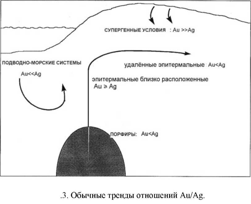 Обычно наблюдаются некоторые тренды Au/Ag (рис. 12.3), хотя имеются исключения из любого правила. В эпитермальных месторождениях отношение Au/Ag уменьшается вдоль потока гидротерм, поскольку золото менее растворимо и оно отлагается первым. Соответственно это отношение увеличивается с глубиной в эпитермальных месторождениях (т.н. Сиротан, рис.12.4). Однако в порфировых месторождениях может встречаться противоположный тренд, поскольку в полиметаллических сульфидах содержится большая примесь серебра, которое обычно отлагается вблизи расположенной зоны. В месторождениях VHMS отношение Au/Ag обычно очень низкое, потому что степень хлоридного комплексообразования Ag в морской воде производится минерализованными гидротермами.