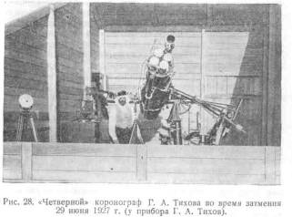 Цікаві висновки отримав відомий пулковський астроном Г.А. Тіхов в результаті фотометричної обробки платівок, знятих його "четверним" коронограф (рис.). Прилад являє собою з'єднані разом чотири півтораметрові камери.Вживаючи відповідні кольорові фільтри і підходящі сорти фотографічних платівок, Г.А. Тіхов зміг отримати фотографії корони в чотирьох різних ділянках спектра-від фіолетового до червоного, тобто в чотирьох кольорах. З цією оригінальною інструментом Г.А. Тіхов їздив до Швеції спостерігати затемнення 29 червня 1927, спостерігав затемнення 19 червня 1936 і 21 вересня 1941 Вивчення корональних негативів дозволило отримати розподіл кольору в короні. Виявилося, що внутрішня корона червоно Сонця, і температура її, отже, трохи нижче температури поверхні Сонця. Це спростовує думку про тотожність кольору корони і Сонця, укорінене після дослідження німецького астронома Гротріана.