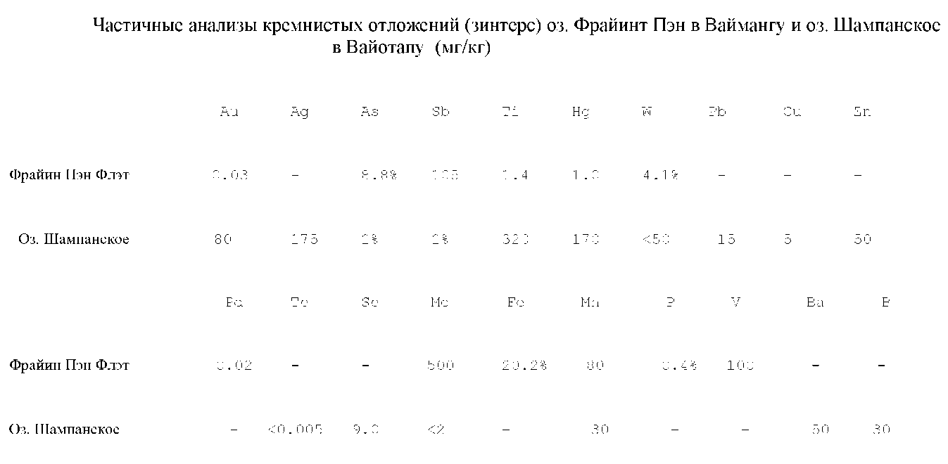 Вайотапу и Ваймангу располагаются на удалении 10 км друг от друга. Они имеют почти идентичное геологическое строение с точки зрения глубины, типа фундамента и состава вмещающих пород, и составы гидротерм в водовмещающих комплексах по существу одни и те же. Сравнение двух анализов поверхностных отложений показывает различие содержания таких элементов, как золото и олово, хотя они могут быть в географически, геологически и геохимически похожих районах. Высокое содержание олова в осадках Ваймангу вызвано селективным отложением его на гидроокислах железа, которые стабильны при рН 4 в поверхностных водах. Эти гидроокислы железа не стабильны в гидротермах оз. Шампанского; скорее всего, уникальные химические условия оз. Шампанского являются главной причиной для эффективного отложения золота.