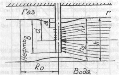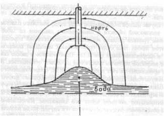 При эксплуатации нефтяных или газовых скважин с подошвенной водой, а также при дренировании нефтяной оторочки в определенных условиях проявляется тенденция к деформированию поверхности раздела двух фаз, которая принимает холмообразный вид, образуя конусы воды, конусы нефти или конусы воды и газа. При некоторых установившихся условиях отбора соответствующие деформированные поверхности раздела находятся в равновесии и не оказывают существенного влияния на приток добываемого флюида к скважине. Если же превысить депрессию и, соответственно, отбор нефти или газа сверх некоторой предельной величины, то вода прорвется в скважину, что может привести к ее прогрессирующему обводнению, а при дренировании нефтяной оторочки возможен прорыв подошвенной воды и верхнего газа. Таким образом, существует предельная высота вершины конуса, которой соответствуют предельная депрессия и безводный или безгазовый дебит.
