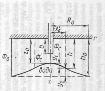 Ф0, Фс, Фс' - потенциалы скорости фильтрации на соответственно условном контуре питания радиуса R0, контуре скважины радиусом гс, условном контуре внутренней зоны притока радиусом R0' =h0; У1, У2 - расстояние от точки конуса с координатами (R0,h) до соответственно вершины конуса и ВНК; Z0 - ордината вершины конуса; b - величина вскрытия пласта
