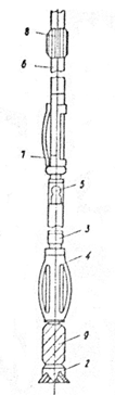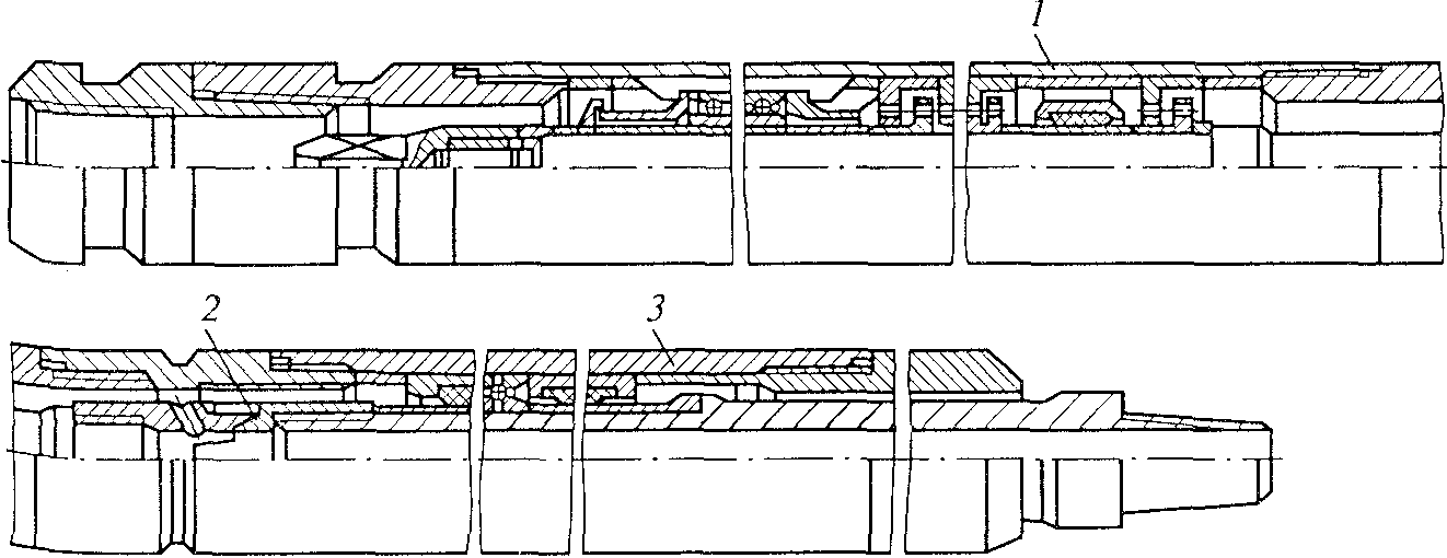 Рис. 8. Турбинный отклонитель ТО-2: 1 — турбинная секция; 2 — шарнирное соединение; 3 — шпиндельная секция