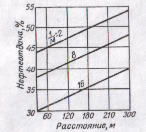 Рис.4. Нефтеотдача к моменту прогрева воды в эксплуатационные скважины в зависимости от свойств нефти и среднего расстояния от нагнетательных скважин до контура нефтеносности.