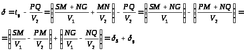 а) Времена запаздывания. Понятие времени запаздывания, введенное Гарднером, широко используется в стандартной интерпретации данных МПВ главным образом благодаря тому, что многочисленные алгоритмы, основанные на использовании времен запаздывания, дают довольно точные результаты. Если принять, что времена вступления преломленной волны уже исправлены за рельеф и ЗМС, то время запаздывания, относящееся к траектории SMNG на рис. 2, представляет собой наблюдаемое время вступления преломленной волны в точку G (t>g>) минус время, затраченное волной на прохождение пути от точки Р до точки Q (проекция траектории на преломляющую границу) со скоростью V>2>. Обозначив время запаздывания буквой , запишем