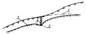 1 — уровень грунтовых вод до строительства дренажа; 2 — дрена; 3 — кривая депрессии; 4 — обратная засыпка траншеи с уплотнением