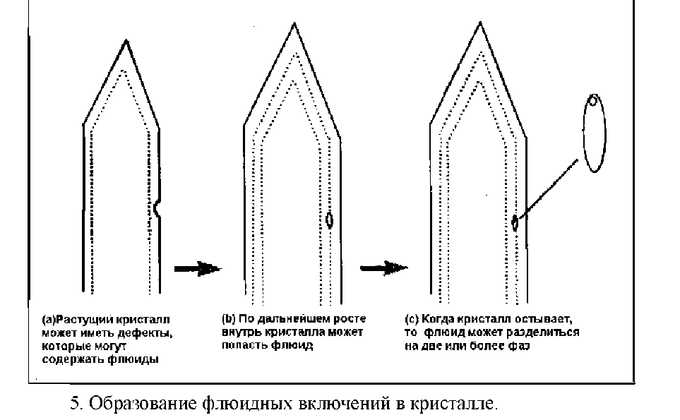 Флюидные включения представляют собой дефекты в кристаллах, образованные в процессе отложения руд или после него (рис..5). Все кристаллы имеют флюидные включения, некоторые из них твёрдые. Для наших целей важными являются многофазные флюидные включения, т. е. такие которые содержать жидкость и газ. Они могут также содержать одну или более твердых фаз («дочерние кристаллы») и могут иметь две несмешиваемые жидкости. Существует широкий интервал возможных составов флюидов. Использование флюидных включений в исследовании эпитермальных систем будет успешным тогда, когда большая часть включений в этих средах представлена простыми включениями, которые относительно легко интерпретировать. В порфировых системах флюидные включения могут дать также ценную информацию, но они, как правило, более сложные, требуют значительной коррекции условий давления и более трудно интерпретируемые.