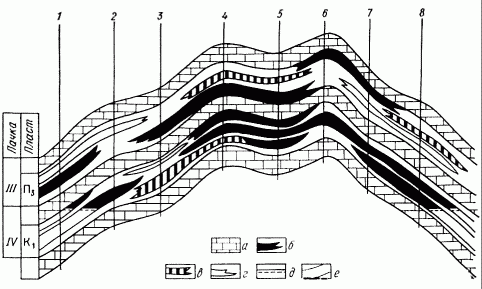 Рис. 2. Схематический профиль нефтеносной пачки каширско-подольских отложений Арланской площади. а - плотный раздел между пластами; прослои: б - промышленно нефтеносные, в - слабонефтенасыщенные, г - водонасыщенные; д - ВНК; е - плотные породы в продуктивном пласте; 1-8-скважины