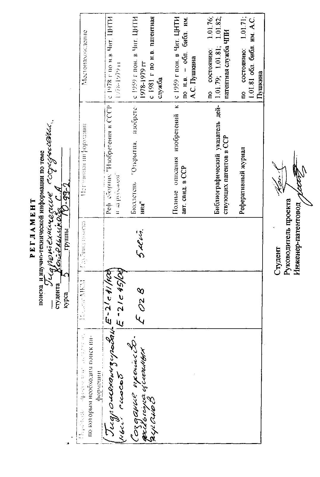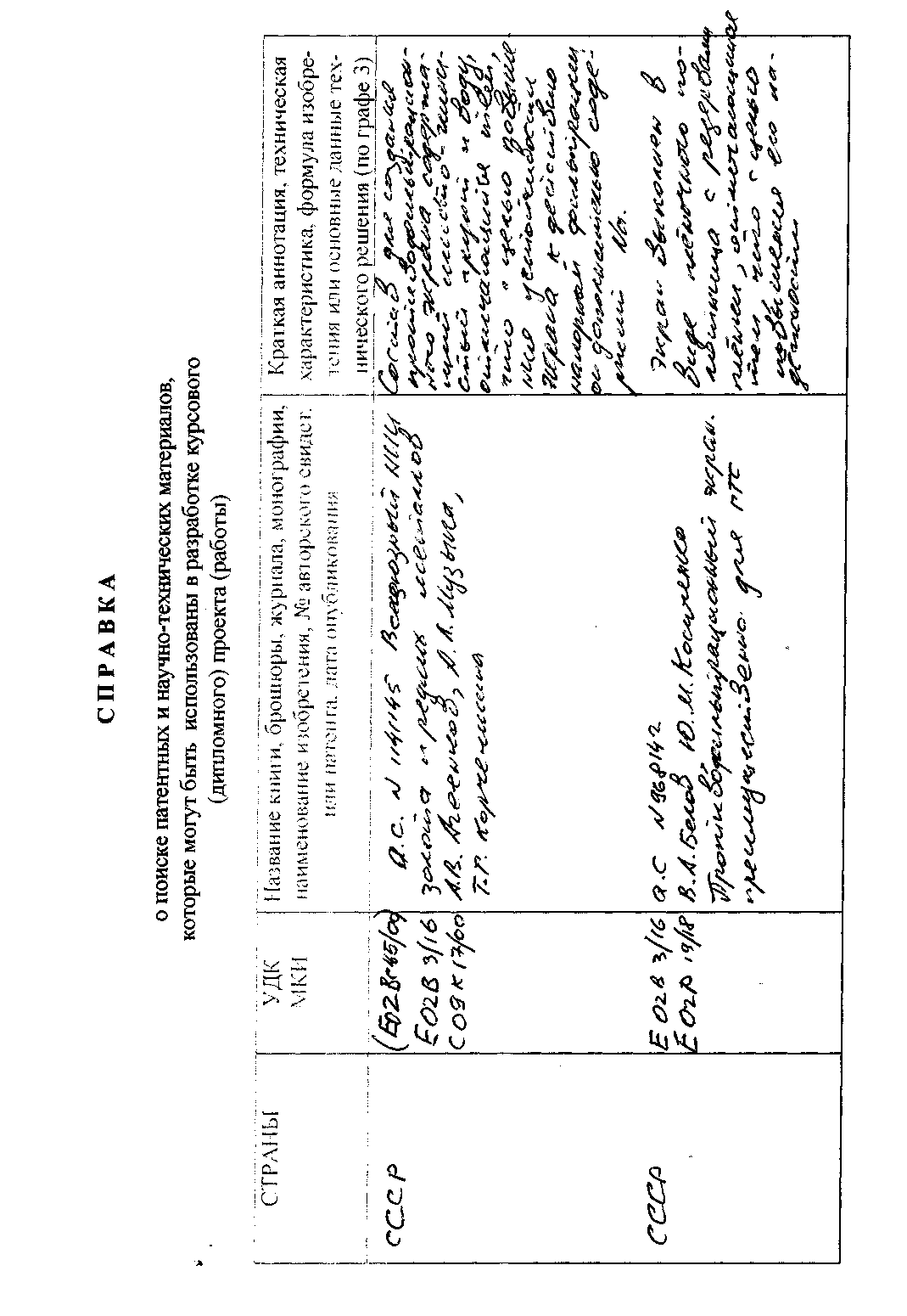 Примечание: В случае принятия решения об использовании в дипломной работе (проекта) выявленной разработки защищенной патентом, студент обязан сделать проверку в отношении СССР. Проверка производится путем просмотра "Указателя действующих патентов в СССР".