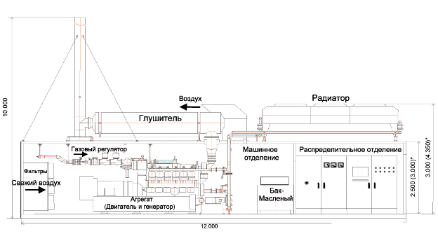 Контейнер разделен на машинное отделение, помещение для камеры сжигания и помещение для распределительного устройства. В машинном отделении находится насос по отсасыванию газа. К распределительному устройству относится и комплект автоматического регулирования компрессора, камеры сжигания, а также техника для анализа газа. В каждое из отделений можно попасть снаружи через отдельную дверь.