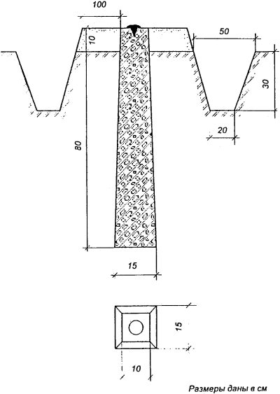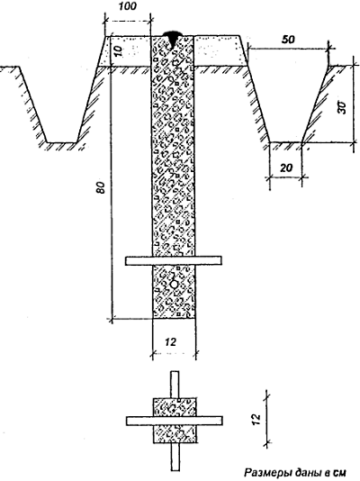 - 80 см, диаметром 5 - 7 см, железные штыри и трубы, забитые в грунт на 0,4 - 0,6 м.
