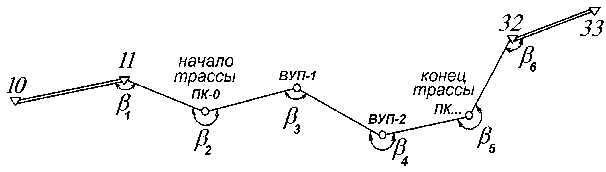 Окончательно выбранное положение вершин углов поворота закрепляют на местности деревянными или железобетонными столбами и составляют абрис привязки этих точек к местным предметам. Между закрепленными вершинами углов ВУ (рис.1) поворота трассы прокладывают теодолитных ход, измеряя по ходу углы β>1>, β>2>, и т.д. и длины сторон L>1>, L>2>, и т.д. Углы поворота φ1 трассы определяют как дополнение правого угла до 1800. При повороте линии вправо φ>п>=1800- β; при повороте влево φ>л>=β-1800. углы измеряют одним приемом со средней квадратической погрешностью 0,5/.