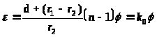 Угол ε`отклонение луча линзой при угле падения φ луча на линзу зависит от типа и параметров линзы. Для линзы типа менаска толщиной d, обращенного к падающему лучу выпуклой стороной, имеющему радиусы кривизны r1 и r2 и показатель преломления n: