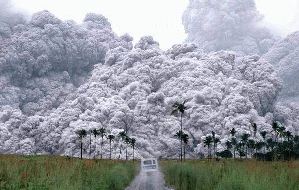 Вулканический пепел. Представляет собой мельчайшие (до 1 - 2 мм.) частицы пород, раздробленные взрывом. На пепел приходится основная доля пирокластического материала. Во время мощных взрывных извержений огромные тучи вулканического пепла и газа, поднимающиеся над вулканом, образуют плинианские (эруптивные) колонны, достигающие 1 - 10 и, в исключительных случаях, десятков километров в высоту. Объём пепла достигает кубического километра и более. В этих случаях пепел разносится воздушными течениями на огромные расстояния, со скоростью около 80 - 100 км/ч. При извержении вулкана Пинатубо граница пеплопада проходила на расстоянии нескольких тысяч километров. Пепел извержения вулкана Кракатау распространился по всей Земле.