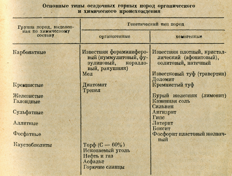 Осадочные породы по способу образования делятся на четыре группы: 1) обломочные; 2) органического происхождения; 3) химического происхождения; 4) смешанного происхождения. Породы органического и химического происхождения, кроме того, подразделяются по химическому составу (табл. 1): на карбонатные, галоидные, кремнистые и др. Смешанные породы (мергель, опока и многие другие) образуются за счет накопления осадков различного происхождения.