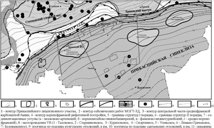 В конце 70-х годов были открыты Оренбургское и Астраханское ГКМ, Тенгиз и Карачаганак, ряд других месторождений, заставивших говорить о Прикаспийской впадине как о зоне гигантских углеводородных скоплений (рис.1), [6-19]. Открытия месторождений УВ в подсолевом карбонатном комплексе были не случайными, а подготовленными скоординированными усилиями трёх отраслевых министерств СССР, с участием министерств Казахстана, по комплексным программам ускоренного опоискования Прикаспийской впадины, с подключением всех отраслевых институтов всесоюзного значения, в течение трёх пятилеток (1976-1990). На этапе поиска атоллоподобные органогенные постройки небольшой площади (240–400 км2), но значительной высоты (более 1000 м) Тенгиз и Карачаганак были выявлены по материалам гравиразведки и сейсморазведки МОГТ-2Д [14-18]. Прогноз развития шельфовых карбонатных пород, включающих рифогенные тела, до недавнего времени проводили на основе модели карбонатного кольца Прикаспийской впадины. Целенаправленный поиск карбонатных массивов на основе анализа внутренней структуры подсолевого комплекса, с учетом допермского регионального плана, стал стратегией геолого-поисковых работ на нефть и газ в Прикаспийской впадине [12].