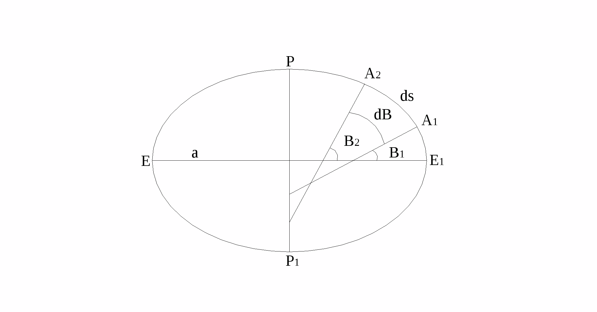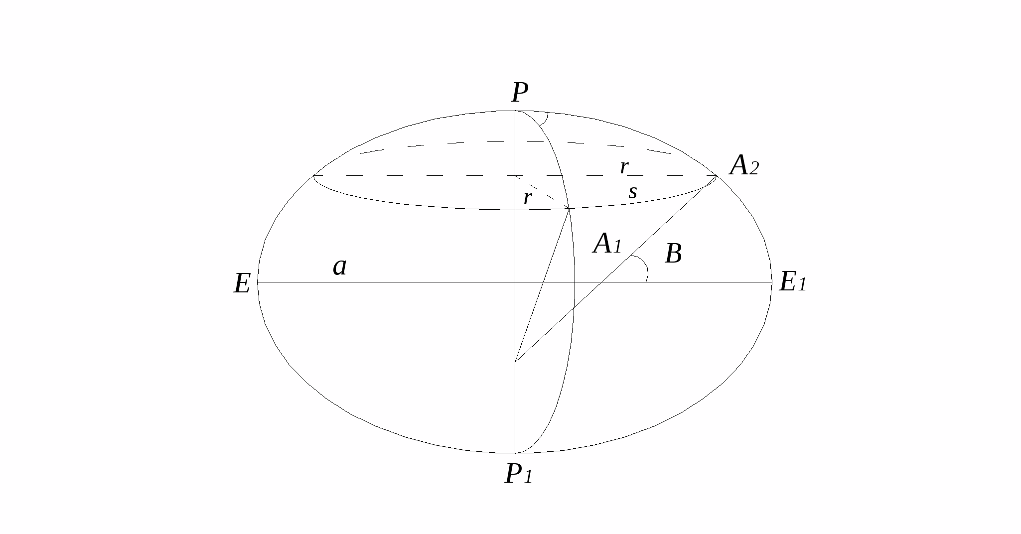 А>1> – точка на меридіанному еліпсі з широтою В>1>. А>2> – точка на меридіанному еліпсі з широтою В>2>.