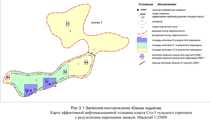 Залесное месторождение. Южное поднятие. Карта эффективной нефтенасыщенной толщины пласта Стл-3 тульского горизонта с результатами переоценки запасов (Рис. 3.1).