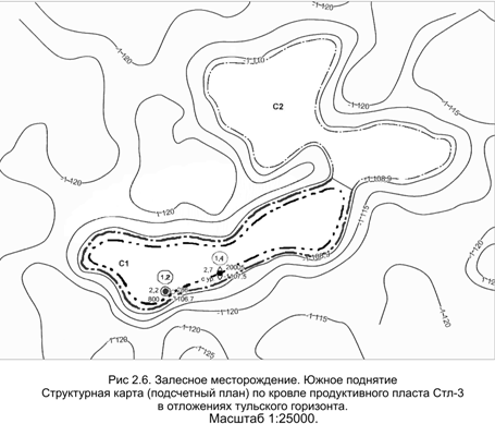 Залесное месторождении. Южное поднятие. Структурная карта (подсчетный план) по кровле продуктивного пласта Стл-3 в отложениях тульского горизонта (Рис 2.6).