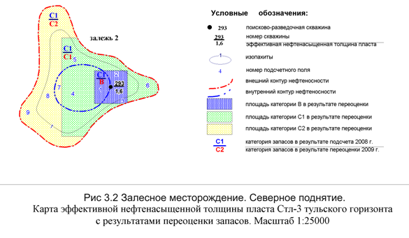 Залесное месторождение. Северное поднятие. Карта эффективной нефтенасыщенной толщины пласта Стл-3 тульского горизонта с результатами переоценки запасов (Рис. 3.2).