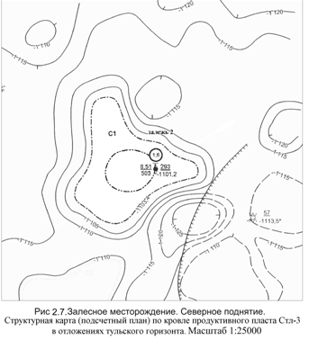 Залесное месторождении. Севрное поднятие. Структурная карта (подсчетный план) по кровле продуктивного пласта Стл-3 в отложениях тульского горизонта (Рис 2.7).