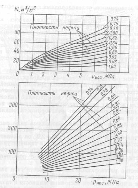Давление насыщения обычно определяют по пробам пластовой нефти; при этом одновременно с давлением насыщения определяют количество газа, растворенного в нефти (в м3/м3). В процессе добычи нефти и газа количество добытого газа на единицу добытой нефти выражают обычно в м3/т. Если количество растворенного в нефти газа не превышает 80 м3 на 1 м3 нефти, следует пользоваться верхним графиком. Для нефтей с большим содержанием растворенного газа применяют нижнюю диаграмму.