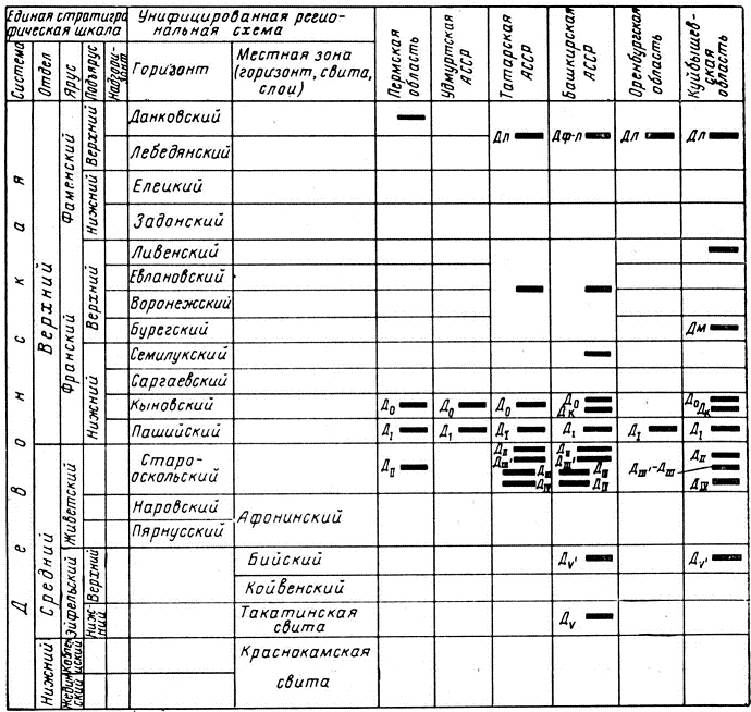 В Волго-Уральской области наиболее часто выделяются два проницаемых пласта, один из которых приурочен к верхней части пашийского горизонта, другой – к нижней. Они именуются ДI и ДII в Самарской области, Д и Д0 по существовавшей ранее номенклатуре в Оренбургской области и в настоящее время в этой области ДI. В Татарии и Башкирии в пашийском горизонте также выделяется пласт ДI с обозначение отдельных пропластков буквами латинского алфавита.