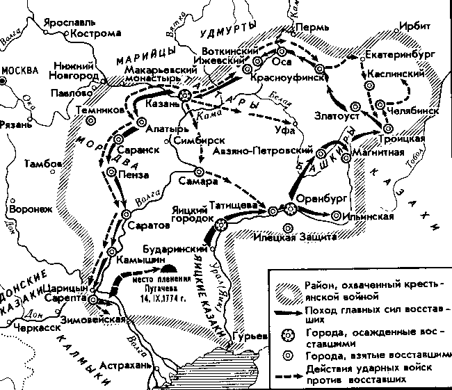Правительственные войска поспешили под Казань. Здесь Пугачеву было нанесено жестокое поражение. С отрядом в несколько сот человек вождь повстанцев переправился на правый берег Волги и вступил на территорию, где большинство населения составляли крепостные, а также государственные крестьяне из татар, чувашей, марийцев и мордвы. Июль и август 1774 г. стали самыми тяжелыми месяцами для правительства и дворянства. Восстание охватило сотни селений, пылали помещичьи усадьбы. Опять вокруг Пугачева собралось множество повстанцев. К лету 1774 г. относятся самые выразительные указы самозванца. В одном из них говорилось: