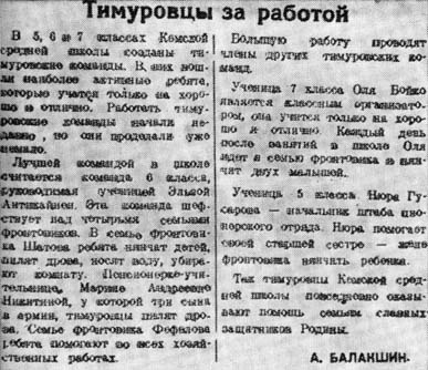27 июня 1941 года “Правда” сообщала, что около 2 тыс. московских школьников пришли на промышленные предприятия, что бы заменить ушедших на фронт. В начале июля свыше 1,5 тыс. школьников Томска встали за станки вместо ушедших в действующую армию. В стране возникло и ширилось движение “Молодёжь - на производство!”. В это движение быстро включились старшеклассники. В декабре 1941 года школьники г. Горького взяли обязательства без отрыва от учёбы помогать предприятиям лёгкой промышленности в быстрейшем выполнении заказов фронта. После уроков они работали на швейных фабриках, в обувных мастерских, брали заказы на дом и изготовляли ложки, варежки, носки, шарфы, подшлемники, участвовали в пошиве обмундирования.