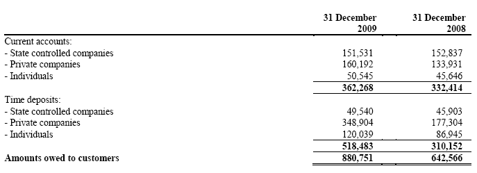 В 2009 году наблюдается тенденция роста общей суммы средств клиентов на 37%. Это происходит за счет увеличения суммы депозитов до востребования на 8,9% и суммы срочных и сберегательных депозитов на 67,2%. В разрезе по типам депозитов наблюдаются следующие тенденции: