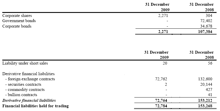 Несмотря на высокую активность Газпромбанка на рынке ценных бумаг при покупке облигаций других компаний, общая сумма финансовых обязательств, предназначенных для торговли снизилась на 52,5%. Главным образом за счет динамики торгов по валютным контрактов на 59838 миллионов рублей из-за нестабильности на валютных рынках.