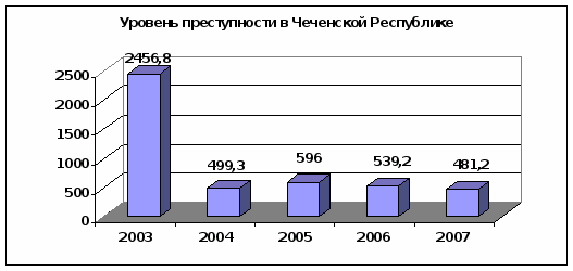 Так, если в 2003г. уровень преступности в Чеченской Республике составлял 2456,8 на 100 тыс. населения, то в 2007 г. – 481,2 (в России данный показатель равнялся 1923,0 и 2519,0 соответственно). Таким образом, по отношению к 2003 г. снижение преступности составило 80,4%. В 2007 году общее количество зарегистрированных преступлений снизилось на 9,2%, при этом в 6 районах республики отмечался рост преступности. Наиболее заметно увеличение этого показателя в Надтеречном (+15,1%), Сунженском (+12,0%) и Веденском (+5,7%) районах.