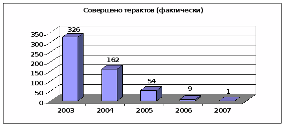 В современном российском обществе наибольший общественный резонанс вызывают террористические акты, поэтому правоохранительными органами уделяется значительное внимание профилактике именно этих преступлений. Принятыми правоохранительными органами мерами удалось добиться значительного снижения количества терактов на территории Чеченской Республики (на 96,0%). Число фактически совершенных терактов (без учета преступлений прошлых лет) снизилось с 326 преступления в 2003 году до 1 преступления в 2007 году (см. рис. №10).