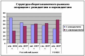Кроме того, в условиях валютной либерализации на конкурентоспособность биржевого рынка все большее влияние оказывает изменение структуры участников российского рынка. Снятие ограничений на движение международного капитала привело к существенному росту операций с нерезидентами на межбанковском рынке. Однако соответствующего расширения доступа на биржевой рынок не произошло: на нем по-прежнему могут работать только российские банки. Поэтому наблюдаемое на российском рынке резкое увеличение операций «резидент—нерезидент» ограничивает рост доли биржевого рынка, где подобные сделки невозможны.