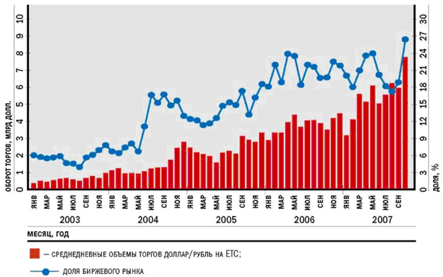 Максимум доли биржевых операций наблюдался в октябре: по операциям «доллар—рубль» — 26,5%, по сделкам «евро—рубль» — 34,5%. Поэтому в настоящее время можно реально говорить о прозрачном, рыночном определении курса рубля на значительном (25—30%) сегменте российского валютного рынка.