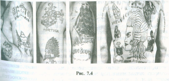 а) татуировки, в которых с помощью надписей, рисунков, условных знаков, аббревиатур отражаются опыт преступника и молодого человека в криминальной деятельности, степень его авторитетности в уголовной среде, его притязания и ожидания;